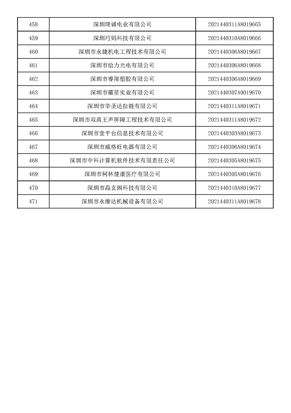 近日,深圳市科技創(chuàng)新委員會(huì)發(fā)布《深圳市2021年第九批入庫(kù)科技型中小企業(yè)名單公告》。根據(jù)《科技型中小企業(yè)評(píng)價(jià)辦法》(國(guó)科發(fā)政〔2017〕115號(hào))和《科技型中小企業(yè)評(píng)價(jià)辦法工作指引(試行)》(國(guó)科火字〔2017〕144號(hào))要求,經(jīng)公示通過(guò),現(xiàn)將深圳市2021年第九批471家入庫(kù)科技型中小企業(yè)名單予以公布。