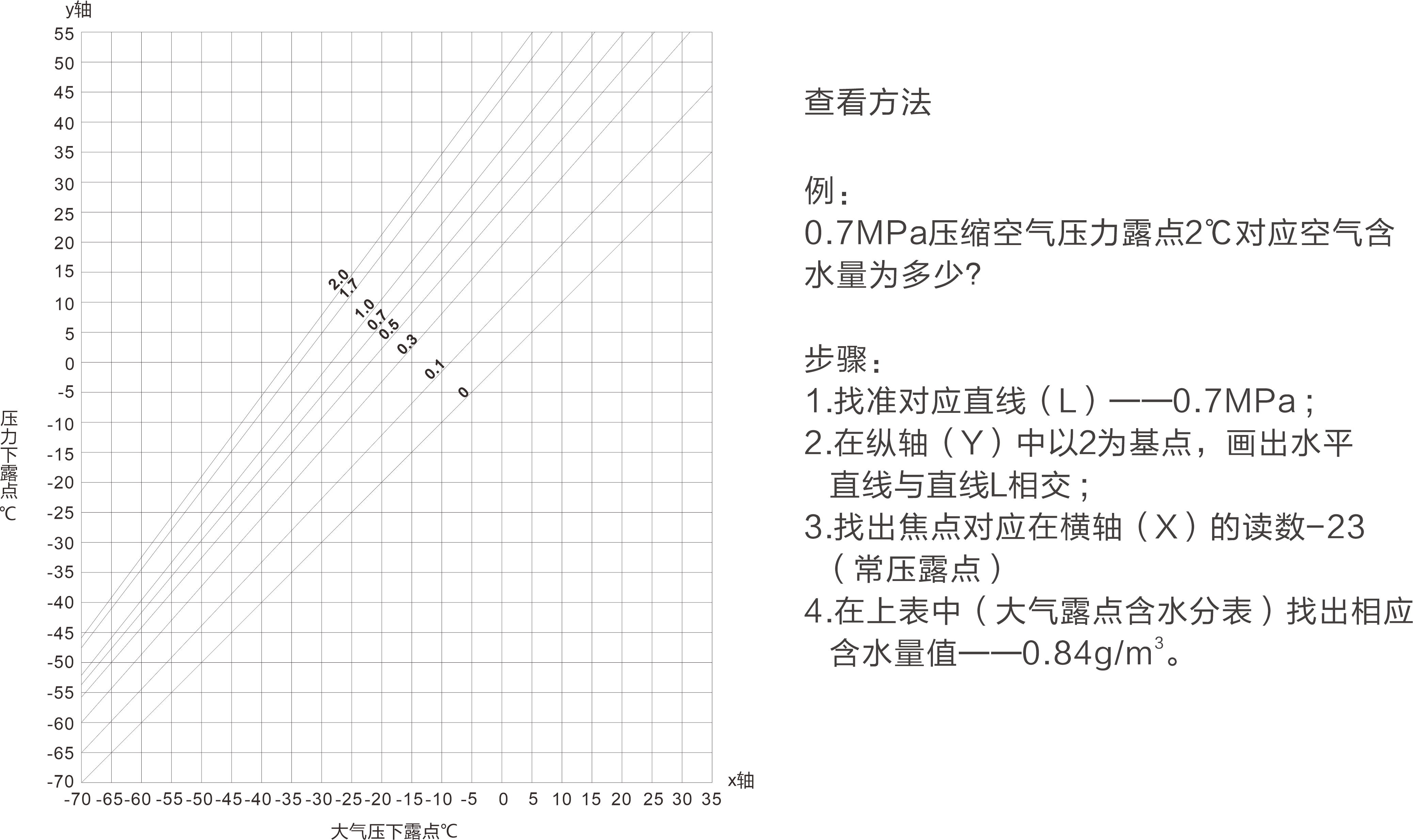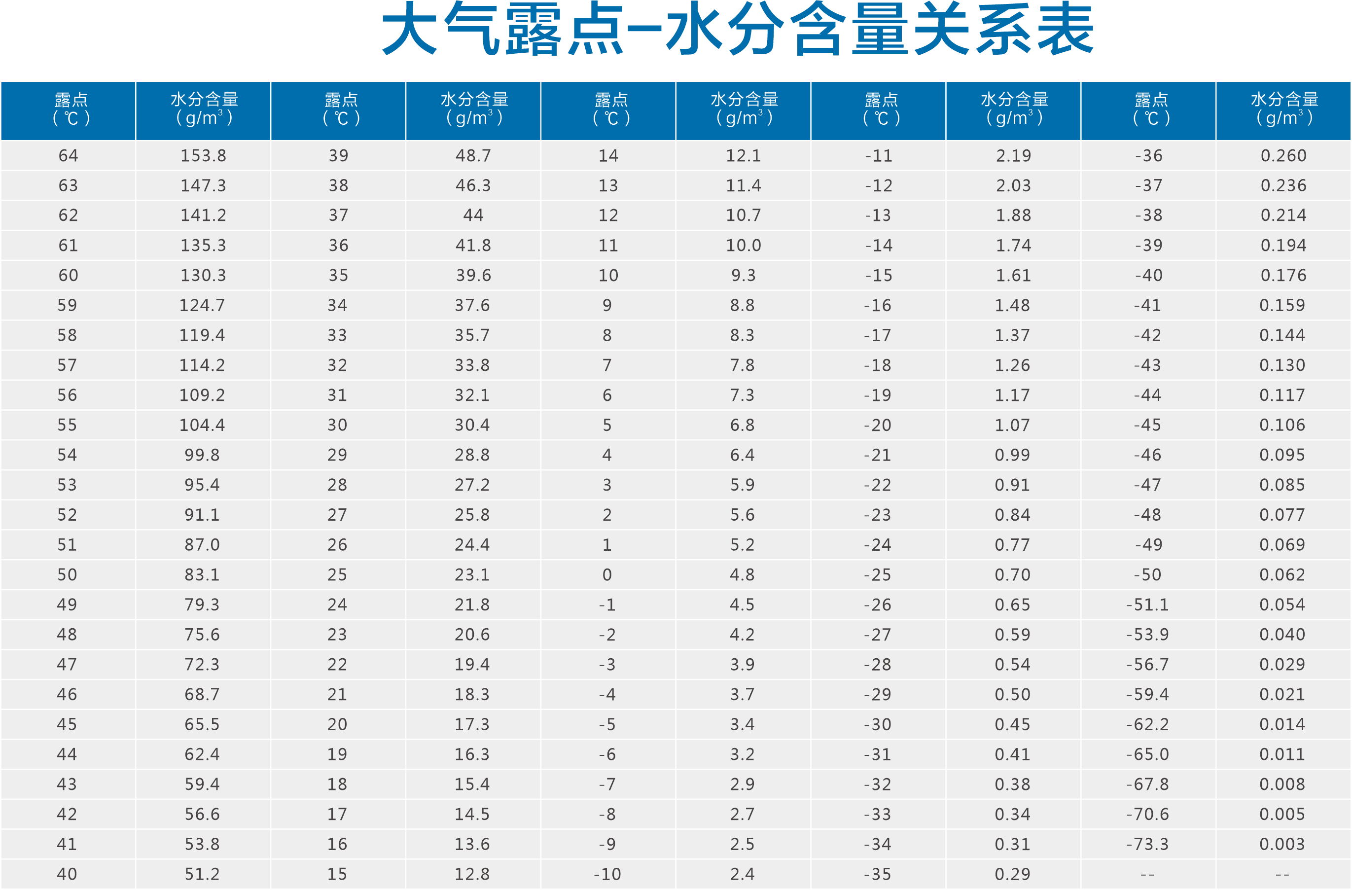 在回南天潮濕天氣中,該如何正確使壓縮空氣系統(tǒng)穩(wěn)定工作并持續(xù)高效運(yùn)轉(zhuǎn)?只要有溫暖的溫度和濕度來源,水分就會在壓縮空氣管道中出現(xiàn)粘結(jié)??諌簷C(jī)吸入的空氣越溫暖,在壓縮和冷卻時(shí)包含大量水分的可能性就越大,通過下圖可以計(jì)算出空氣在不同露點(diǎn)變化中的含水量:
