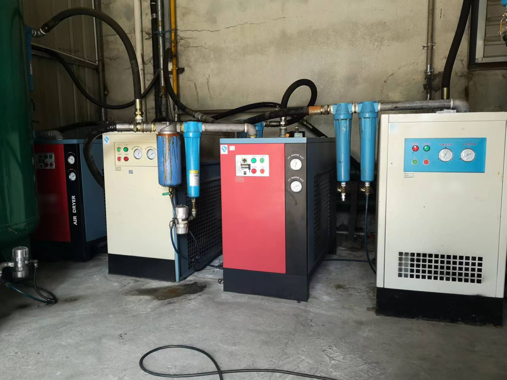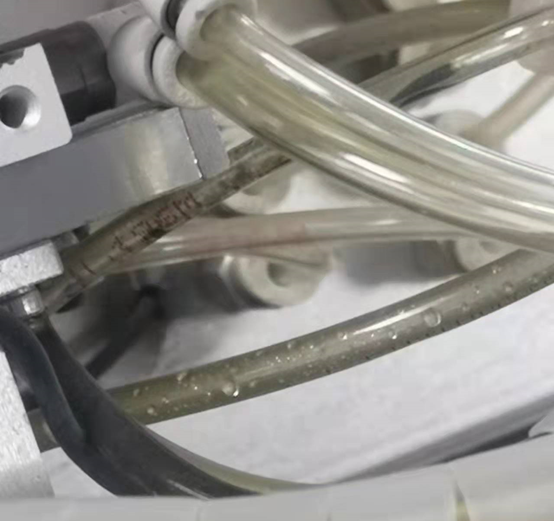某客戶投訴車間用氣端有液態(tài)水,空壓機(jī)代理商多次增加除水設(shè)備(串聯(lián)2臺(tái)冷干機(jī)和21支過濾器),無法解決用氣端液態(tài)水問題,反而增加巨大的壓力損失。