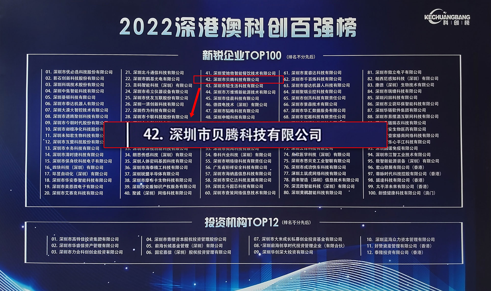 在第五屆深港澳科創(chuàng)百?gòu)?qiáng)榜評(píng)選活動(dòng)中,貝騰科技受2022深港澳科創(chuàng)百?gòu)?qiáng)榜提名委員會(huì)提名并最終入選百?gòu)?qiáng)(第42位),入選公布名單如下: