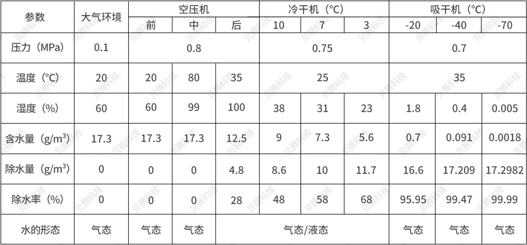 壓縮空氣中的水通常以液態(tài)水和氣態(tài)水兩種形態(tài)存在,且相互可以轉(zhuǎn)化,這就導(dǎo)致壓縮空氣穩(wěn)定可靠的除水成為世界性的難題,通過(guò)下表可以清晰看到壓縮空氣水含量在空壓系統(tǒng)中的變化情況: